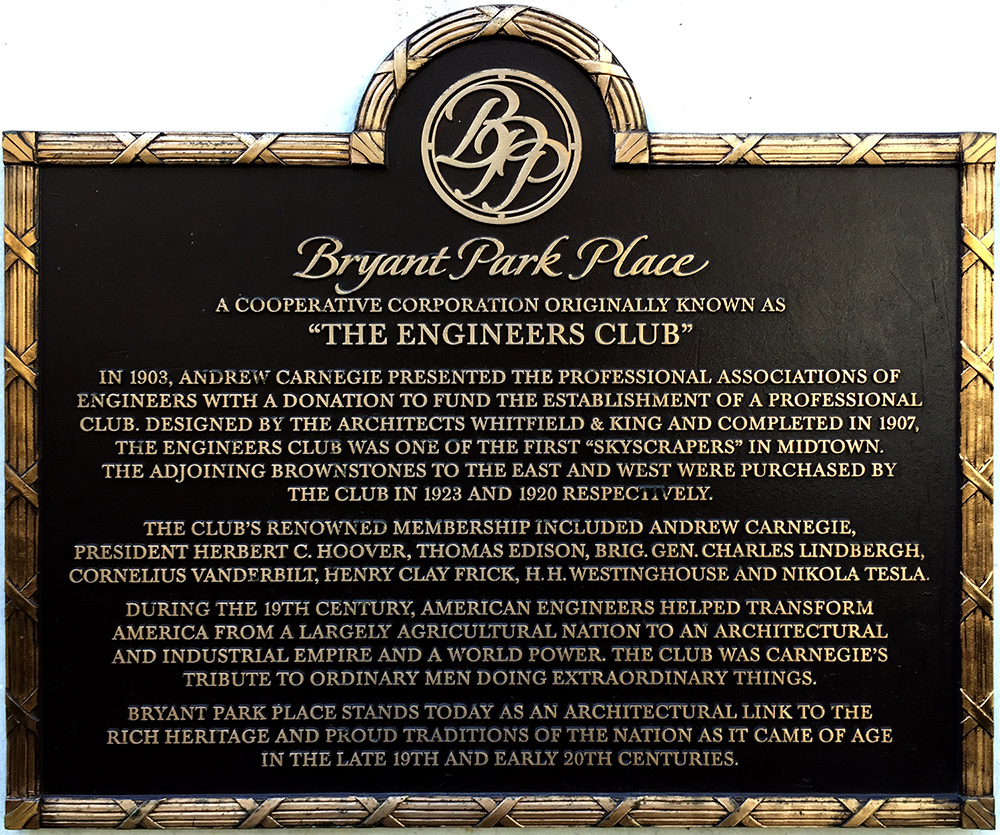 The plaque at the Engineers Club at 32 West 40th street and the Tesla plaque at the New Yorker Hotel